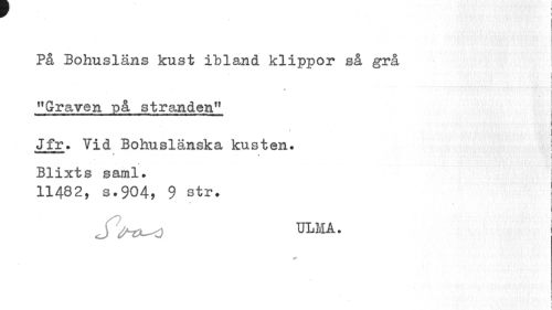 //// v //// På Bohusläns kust ihland klippor så grå //// i i //// i //// "Graven på stranden" //// Jfr» Vid Bohuslänska kusten. //// •tmmmmmmm j //// ! //// • C //// % I //// Blixts saml. //// 11482, s.904, 9 str. //// J Wd ULMA- //// i ////