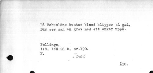 //// ¦ //// i A,.'i. >'( V t ¦."•--•' vsu ' '• • »V t' //// På Bohusläns kuster bland klippor så grå, //// Där ser man en grav med ett ankar uppå. //// - //// ; .. ; , . v., //// Pellinge, //// 1:8, INB 28 b, nr.190. N. //// ÅBO. ////