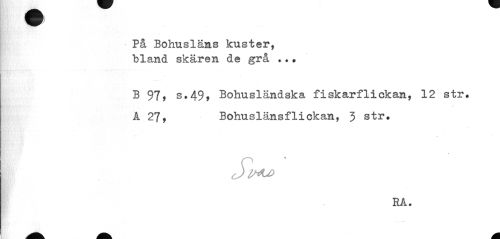 //// På Bohusläns kuster, bland skären de grå ... //// B 97, s.49, Bohusländska fiskarflickan, 12 str. A 27, Bohuslänsflickan, 3 str. //// » //// RA. ////