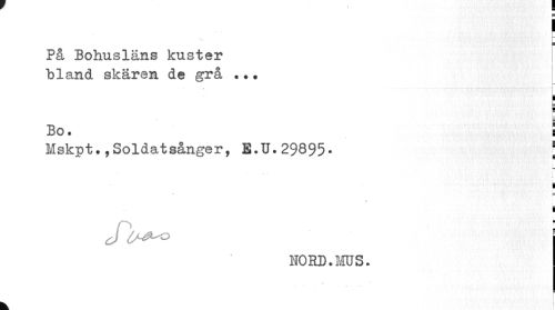 //// På Bohusläns kuster [ //// bland skären de grå ... //// )- //// f //// I //// b ¦ //// Bo. j //// Mskpt.,Soldatsånger, E-U.29895- I //// I i //// NORD.MUS. //// k ////