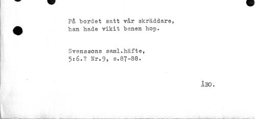 //// På bordet satt vår skräddare, ^^ han hade vikit benen hop. //// Svens sons saml.häft e, //// 5:6.? Kr.9, s.87-88. //// 0 //// åbo. ////