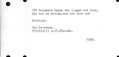 //// "På Brunnsta hagen där ligger ett torp, //// % //// Där bor en käring,som har stor ork Nidvisor. //// v //// Upl.Österuna, //// 303:814(1) s.57»Thorsen. //// ULMA. ////
