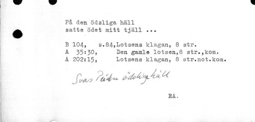 //// På den ödsliga häll //// •satte ödet mitt tjäll ... //// f ... //// B 104, s.84,Lotsens klagan, 8 str» A 35^30, Den gamle lotsen,8 str.,kom. //// A 202:15, Lotsens klagan, 8 str.not.kom. //// RA. ////