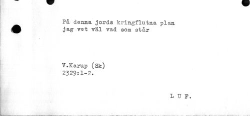 //// På denna jords kringflutna plan jag re t väl rad som står //// V.Karup (Sk) 2329:1-2. //// L II F. ////
