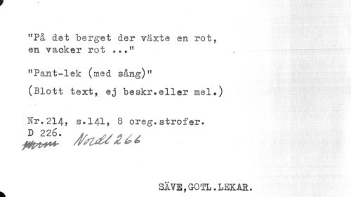 //// "På det berget der växte en rot, en vacker rot //// "Pant-lek (med sång)11 //// (.Blott text, ej beskr.eller mel*) //// ... r //// Nr.214, s.141, 8 oreg.strofer. //// SÄVE,GOTL.LEKAR. //// k ////