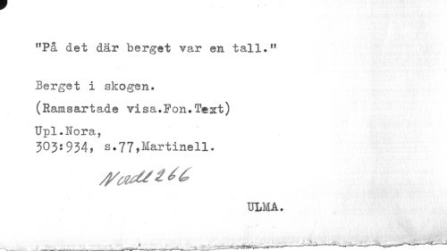 //// f,På det där berget var en tall.*1 //// Berget i skogen. (Ramsartade visa.Fon.Text) Upl.Nora, //// 303:934? s.77,Martinell. //// ULMA . ////