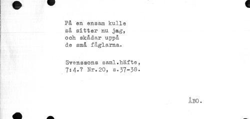 //// På en ensam kulle så sitter nu jag, och skådar uppå de små fåglarna. //// Svenssons saral. häfte, 7:4.? Nr.20, s.57-38. //// ÅBO. ////