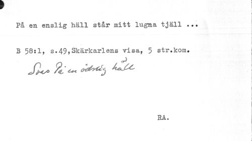 //// I //// På en enslig häll står mitt lugna tjäll //// % //// i //// B 58:1, s.49,Skärkarlens visa, 5 str.kom» //// ^ //// i //// RA. //// i l ////