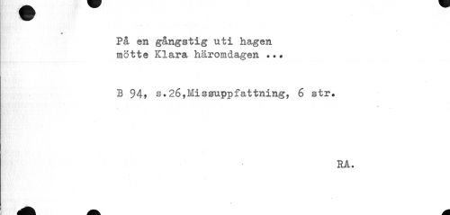 //// + //// På en gångstig uti hagen //// mötte Klara häromdagen //// B 94, s.26,Missuppfattning, 6 str. //// * //// RA. //// » ////