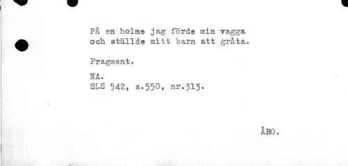 //// På en holme ja g förde min vagga ^^ och ställde mitt "barn att gråta. //// Fragment. NA. //// SLS 542, s.550, nr.313» //// ÅBO. ////