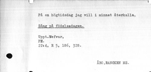 //// På en högtidsdag jag vill i minnet återkalla, Sång på födelsedagen. Uppt.Wefvar, //// PE~. //// 22:4, r 5, 186, 328. //// ÅBO,RåNCKEIT MS. //// # //// Ni , ////