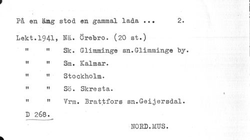 //// På en äng stod en gammal lada . •• 2. //// i //// Lekt.1941, Nä. Örebro. (20 st.) //// ff 11 Sk. Glimminge sn.Glimminge by. //// tf r! Sm. Kalmar. w « Stockholm. //// < 1 //// ff rf Sö. Skresta. //// I //// " " Vrm. Brattfors sn.Geijersdal. i) 268. //// HORD.MUS. //// k ////