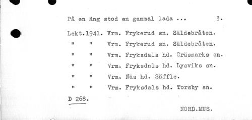//// På en äng stod en gammal lada ... 3* //// Lekt.1941. Vrm. Frykerud sn. Säldebråten. //// " " Vrm. Frykerud sn. Säldebråten. //// » " Vrm. Fryksdals hd. Gräsmarks sn. //// rt Vrm. Fryksdals hd. Lysviks sn. //// « « Vrm. Ms hd. Säffle. //// 11 M Vrm. Fryksdals hd. Torsby sn. //// D 268. //// FORD. MUS. ////