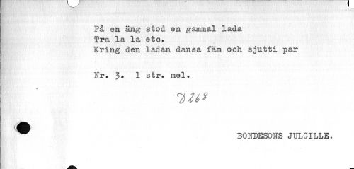 //// På en äng stod en gammal lada Tra la la etc. //// Kring den ladan dansa fäm och sjutti par //// t //// Nr. 3* 1 str. mel. //// yii* //// w BONDESONS JULGILLE. ////
