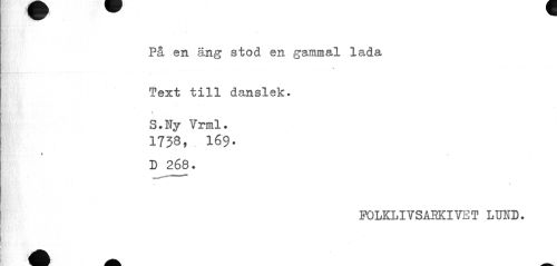 //// mm — ^ //// På en äng stod en gammal lada //// i //// Text till danslek. //// * //// S.Ny Vrml. //// 1738, 169- //// 9 \ //// D 268. //// FOLKLIVSABKIVET LUND. ////