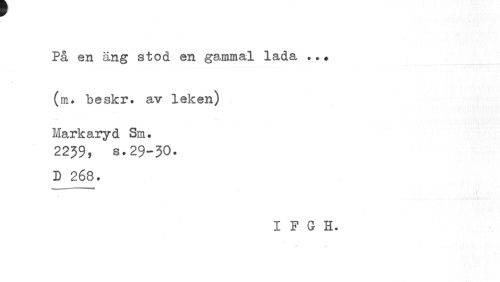 //// På en äng stod en gammal lada ... 3* //// (m. beskr. av leken) //// Markaryd Sm. 22J9, s.29-30. //// D 268. //// 11 ¦ ———— //// I F G H. ////