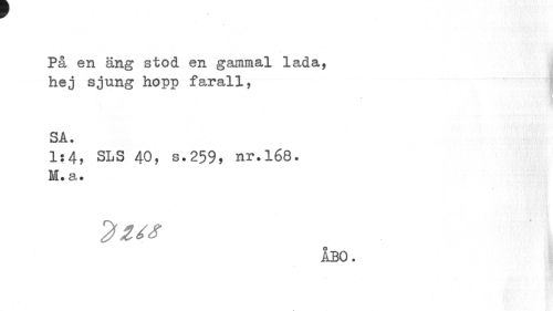 //// På en äng stod en gammal lada, //// hej sjung hopp farall, //// SA. //// 1:4, SLS 40, s.259, nr.168. //// M. a. //// yzts; //// ÅBO. ////