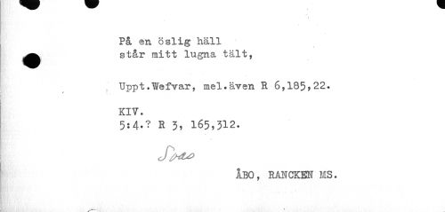 //// m • * //// I //// På en öslig häll ^^ står mitt lugna tält, //// Uppt.Wefvar, mel »även R 6,185?22. Kl V. //// 5:4.? R 3, 165,312. //// ÅBO, RANCKEN MS. ////