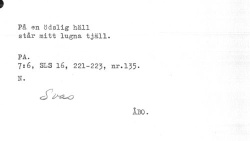 //// På en ödslig häll //// står mitt lugna tjäll. //// PA. //// 7:6, SLS 16, 221-223, nr.135. N. //// ÅBO. ////