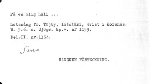 //// På >en ölig häll //// Lotssång fr. Töjby, lotslärl, Qvist i Korsnäs. W. 5.6. n. Sjögr. kp.v. af 115J. //// Del.II, nr.1154. //// «¦» t » //// » //// RANCKEN FÖRTECKNING. //// k ////