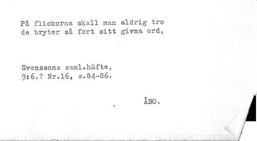 //// På flickorna skall man aldrig tro //// de bryter så fort sitt givna ord, //// # //// Svens SOHS 8 aml.häfte, //// 9:6.? Nr.16, s.84-86. //// "É //// ÅBO. i //// ___:___J ////