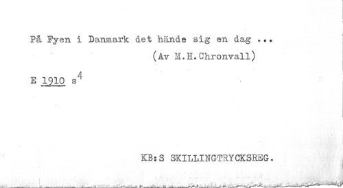 //// 5 //// På Fyen i Danmark det hände sig en dag ... //// (Av M. H. Chronvall) //// • - //// E 1910 s4 //// 1 //// KB:S SKILLINGTRYCKSREG. //// ___ . _ __ : ___...---m---.--- --•-••,<' ////