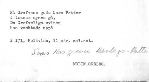 //// t //// På G re fvens gods Lars Petter i trasor synes gå, De Grefveliga svinen han vacktade uppå //// B 171, Folkvisa, 11 str» mel.not» //// J /Uo //// MOLIN,ÖREBRO. //// 1 ////