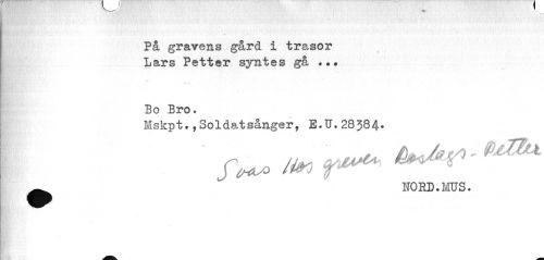 //// — > w //// "" //// På gravens gård i trasor //// Lars Petter syntes gå //// „ //// Bo Bro• //// Mskpt.,Soldatsånger, E.U.28384» //// ^^ NORD. MUS. //// ¦ ////