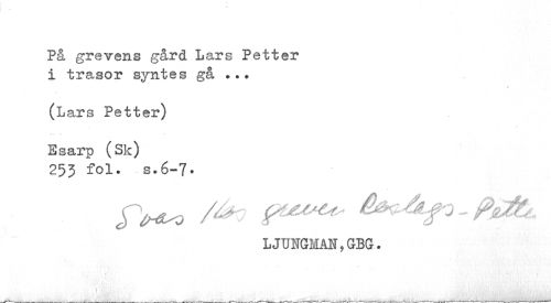 //// På grevens gård Lars Petter i trasor syntes gå ..? //// (Lars Petter) //// Esarp (Sk) 253 fol. 8.6-7. //// OjHto '/&0 pze&t*' //// LJUNGMAN,GBG. //// • • ////