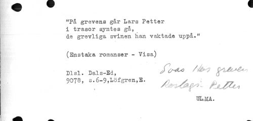 //// V V ^^ ^ //// !tPå grevens går Lars Petter i trasor syntes gå, //// de grevliga svinen han vaktade uppå." //// . //// (Enstaka romanser - Visa) //// Dl si. Dals-Ed, g^^ //// 9078, s.6-9,Löfgren,E. y //// 13L.MA. //// A ^^^ ////
