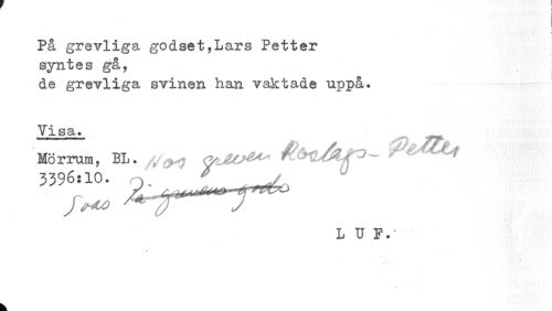 //// På grevliga godset,Lars Petter syntes gå, //// de grevliga svinen han vaktade uppå. Visa. //// Mörrum, BL. //^ //// 3396:10. q. f »6, //// L U F.' //// k ////