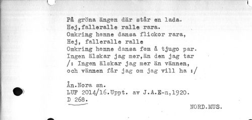 //// * , " — //// På gröna ängen där står en lada. Hej,falleralie ralle rara. Omkring henne dansa flickor rara, Hej, falleralle ralle Omkring henne dansa fem å tjugo par. Ingen älskar jag mer,än den jag tar /: Ingen älskar jag mer än vännen, och vännen får jag om jag vill ha :/ //// In.Nora sn. //// ^ LTJF 2OI4/16. Upp t. av J • A.E-n, 1920. //// D 268. //// NORD.MUS. ////
