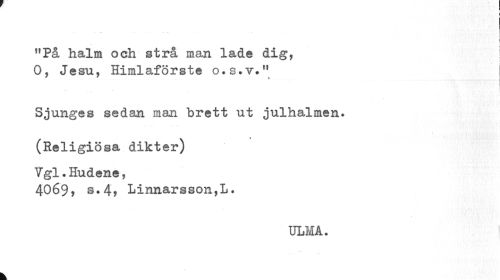 //// ¦ //// "På halm och strå man lade dig, j //// 0, Jesu, Himlaförste o.s.v." //// Sjunges sedan man brett ut julhalmen. //// (Religiösa dikter) Vgl.Hudene, //// 4069> Linnarsson,L. //// ULM A. //// k ////