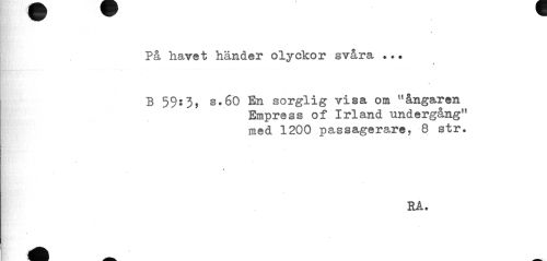 //// På havet händer olyckor svåra .. • //// i //// B 59:3, s.60 En sorglig visa om "ångaren //// Empress of Irland undergång" med 1200 passagerare, 8 str. //// rå. ////