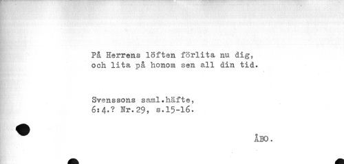 //// På Herrens löften förlita nu dig, och lita på honom sen all din tid. //// Svenssons saml.häfte, //// 6:4.? Kr.29, s.15-16. //// ^ ÅBO. ////