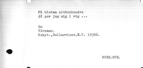 //// På hösten nittonhundra då gav j ag mig i väg ..• //// Sm //// Värnamo, //// Mskpt.,Rallarvisor,E.U. I8386. //// NORD.MUS. ////