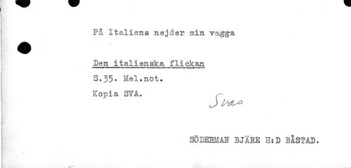 //// På Italiens nejder min vagga Den italienska flickan //// S.35. Mel•not. Kopia SVA. //// SÖDERMAN BJÄRE H:D BÅSTAD. //// é ////