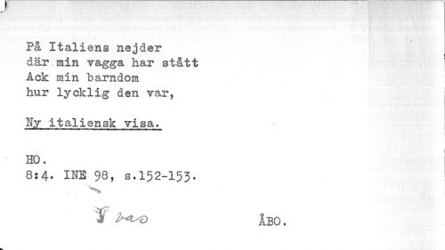 //// 1 » //// På Italiens nejder där min ragga har stått Ack min "barndom hur lycklig den var, //// Ny italiensk visa. //// i //// HO. //// 8:4. INB 98, s.152-153. //// Åbo. ////