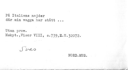 //// På Italiens nejder //// där,min vagga har stått ... //// Utan prov. //// Mskpt.,Visor VIII, s.739,E.U.32072. //// •• - i» • • //// j w //// NORD.MS. ////