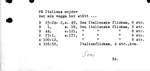 //// På Italiens nejder //// der min ragga har stått ... //// ^^ B 23-24: 2,s. 49, Den Italienska flickan, 8 str* //// B 1, s. 18, Den italienska flickan, 8 str. //// B 44, s.121, ,f " 8 str. //// B 73:1, s.171, « t» »1 q //// A 100:12, ,f 11 11 8 str. //// A 326:50, Italienflickan, 4 str.,kom. //// Swo //// RA. //// A ////