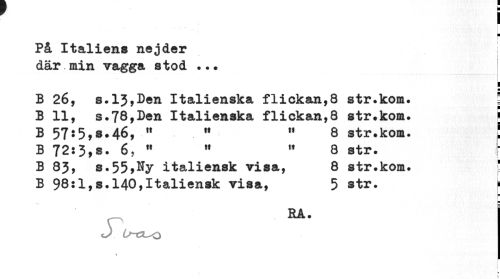 //// I //// ¦ //// På Italiens nejder där min vagga stod .. • //// i ¦ //// B 26, s.13,Den Italienska flickan,8 str.kom. j //// B 11, s.78,Den Italienska flickan,8 str.kom. J //// B 5755,s*46, » 11 11 8 str.kom. ! //// B 72:3,s. 6, " M " 8 str. \ //// B 83, s.55,Ny italiensk visa, 8 str.kom. f //// B 98:1,s.140,Italiensk visa, 5 str. f //// m //// B //// RA. //// <J U-CL^O //// \ //// L l ////