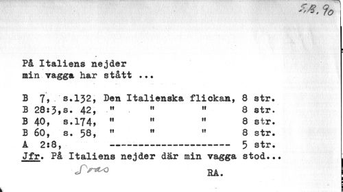 //// 70 //// i //// ¦ //// På Italiens nejder min vagga har stått ... //// B 7, /s.132, Den Italienska flickan, 8 str. B 28:3,s. 42, w 11 " 8 str. //// B 40, s.174, " M " 8 str. //// B 60, s. 58, " 11 w 8 str. //// A 2:8, --- 5 str. //// Jfr. På Italiens nejder där min vagga stod... ; //// JV*^ HA. ////