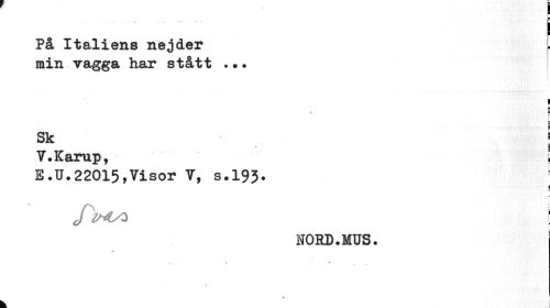 //// På Italiens nejder min vagga har stått ... //// i //// » P //// Sk j //// V.Karup, i //// E.U.22015,Visor V, s.195» //// | //// i- //// /ko I //// NORD. MUS. //// t i ////