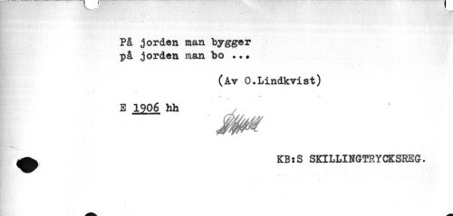 //// På jorden man bygger på jorden man bo • •» //// (Av //// O.Lindkvist) //// B 1906 hh //// A KB s S SKILLINGTRYCKSREG. //// : - - ' ////