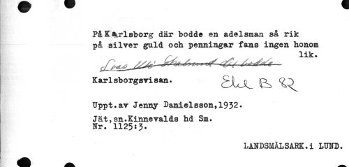 //// PåK%rlsborg där bodde en adelsman så rik på silver guld och penningar fans ingen honom //// Karlsborgsvisan. cTXoC //// Uppt.av Jenny Danielsson,1932» Jät,sn.Kinnevalds hd Sm. //// Hr. 1125:3* //// LANDSMÅL SARK.i LUHD. //// * ////