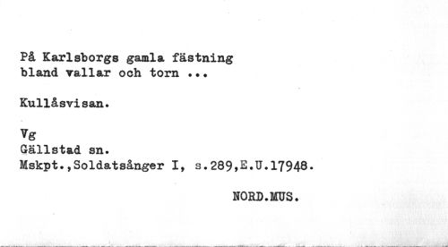 //// På Karlsborgs gamla fästning bland Tallar och torn •*. //// X //// Kullåsvisan. //// Vg //// Gällstad sn. //// Mskpt.,Soldatsånger I, s.289,E.U.17948• //// NORD.MUS. ////