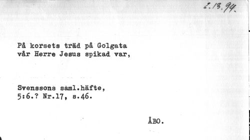 //// I //// På korsets träd på Gölgata vår Herre Jesus spikad var, //// i i //// i //// - //// V //// Svenssona saml.häfte, //// 5:6.? Nr.17, s.46. //// ÅBO. ////