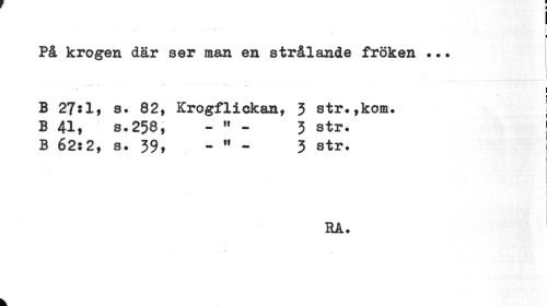 //// 1 //// På krogen där ser man en strålande fröken .?• //// i i i //// i i //// B 27:1, s. 82, Krogflickan, 3 str.,kom. j //// B 41, s.258, - " - 3 str. B 62:2, s. 39, - " - 3 str. //// RA. //// ' J* //// * //// k ////