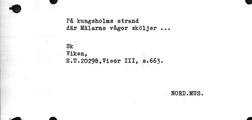 //// På kungsholms strand //// där Mälarns vågor sköljer ... //// Sk //// Viken, //// E.U.20298,Tisor III, s.663. //// é. .. t //// NORD.MUS. ////