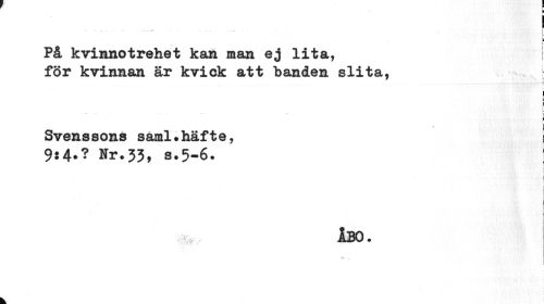 //// I //// I //// ... ' ¦ j //// I //// fc //// l //// På kvinnotrehet kan man ej lita, ! //// för kvinnan är kvick att banden slita, //// i | //// i //// k ¦ //// p //// j //// • • • ¦ • . ¦ • t //// i //// Svenssons saml.häfte, 9:4.? Nr.33, s.5-6. //// i //// ¦ //// i //// ÅBO. ////